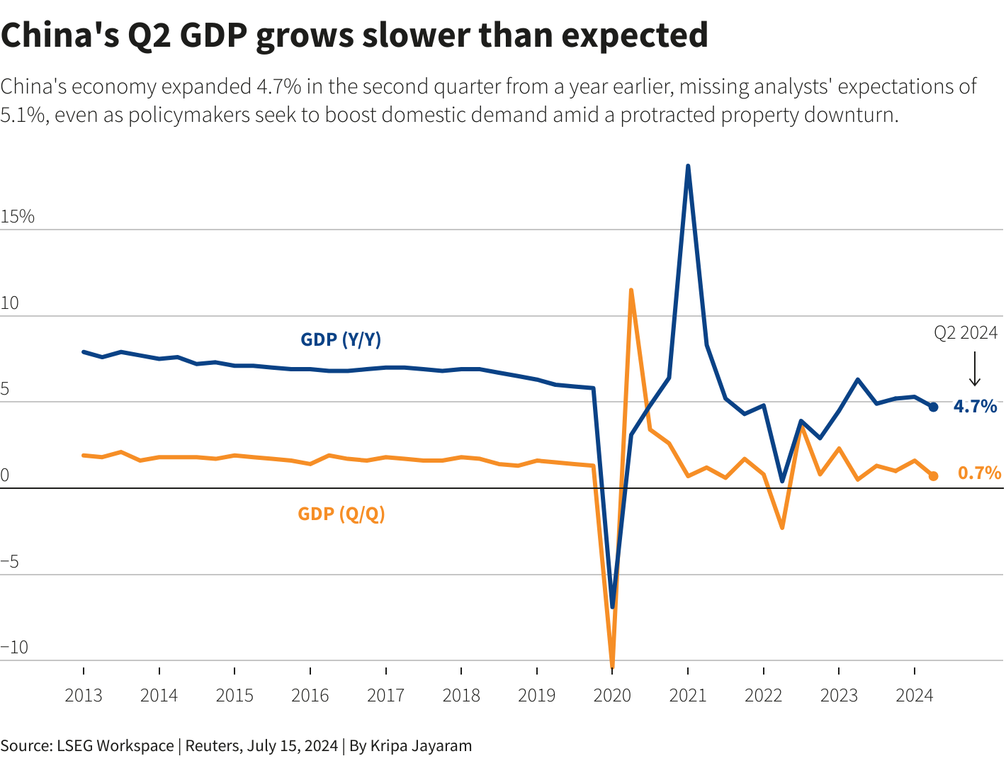 China’s economy, the second-largest in the world, grew much slower than expected in the second quarter of 2024, growing by 4.7% from April to June, its slowest since the first quarter of 2023. [Reuters]