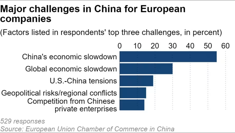 In May the European Union Chamber of Commerce in China said that European companies operating in China are concerned that the slowdown will hurt their profitability.